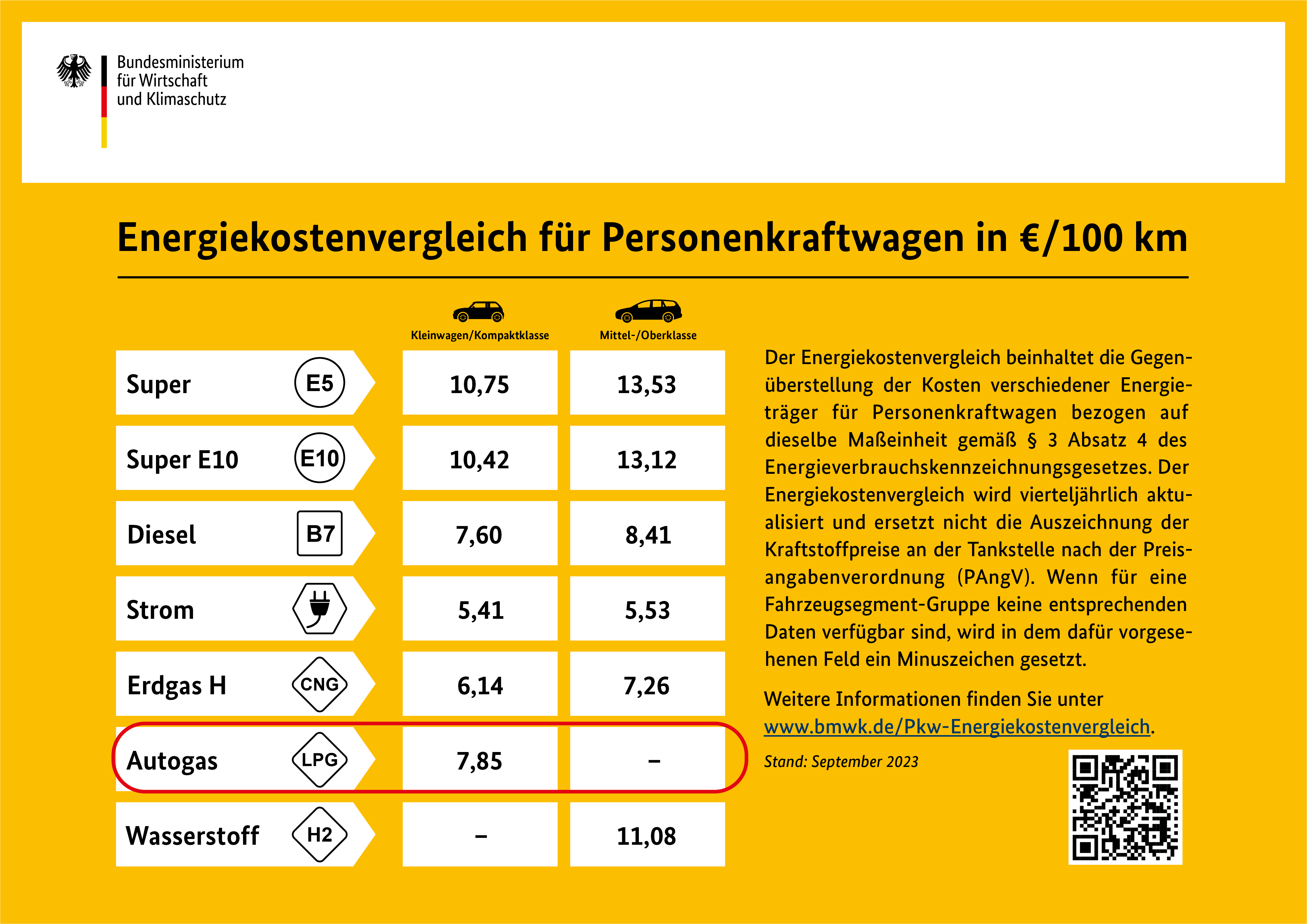 Zukünftig vierteljährlich wird auf den Seiten des BMWi eine Grafik zur Verfügung gestellt, in der die Kosten der Energieträger Super-Benzin, Diesel, Strom, Erdgas H, Autogas und Wasserstoff direkt verglichen werden. Die Veröffentlichung des Aushangs ist darüber hinaus für Tankstellen ab dem 1. Oktober 2021 verpflichtend.
